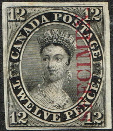 | Canada. 1851 12d Queen Victoria overprinted SPECIMEN. Four good margins. Hinge thin on back. Very scarce. Scott 3p.