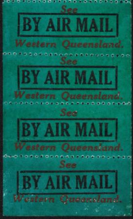 | Australia Airmail Cinderella. 1923 QANTAS "See Western Queensland" green label. Unused (no gum) strip of four. Scarce. Frommer 10a.