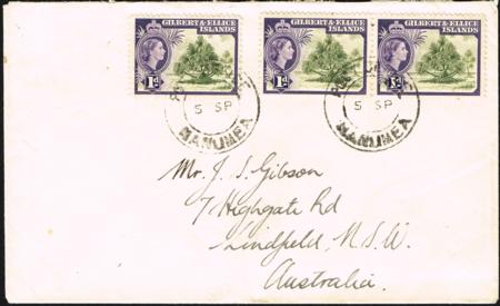 | Gilbert & Ellice Islands. Cover posted Nanumea (5 Sept. No year slug or backstamp) to Australia. |