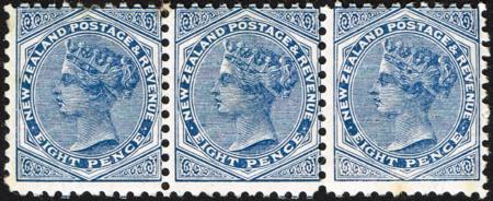 | Second Side Face. 8d blue, perf 11. Mint stip of three. Top right centred. Tone spots. CP D9d. SG 244. Catalogue value $450.