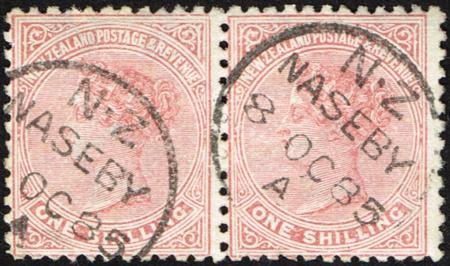 | 1/- pale shade, perf 12 x 11½ (6mm wmk.). Fine used (Naseby, 8 Oct 1885) pair. Left centred. CP D10a. SG 193. |