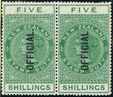 | 5/- Long Queen Official. de la Rue, perf 14½ x 14. UHM/Mint pair. One with no stop after 'Official'. Reasonably centred. CP ZO6h(Z), SG O86a. Catalogue value $1,200.