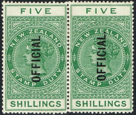 | 1882 5/- Long Queen Official. de la Rue, perf 14½ x 14. Mint pair. No stop after 'Official'. CP ZO6h(Z), SG O86a. |
