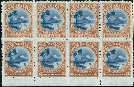 | 1900 Pictorial. 4d Taupo. Perf 11 (wmk.). UHM block of eight. CP E12b, SG 310. |