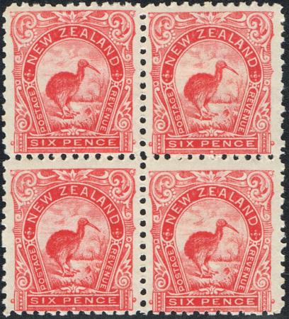 | 1908 Pictorials. 6d large in the brick-red shade. Perf 11 with no watermark. UHM/mint block of four. CP E14c(3), SG 312. cat $1,600+ +GST.