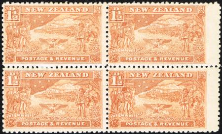 | 1898 1½d Boer War. Perf 11. UHM/LHM block of four with the Row 2/12 re-entry. CP E4a, SG 275b. Thought of as being the best re-entry in NZ stamps. The whole design is doubled.