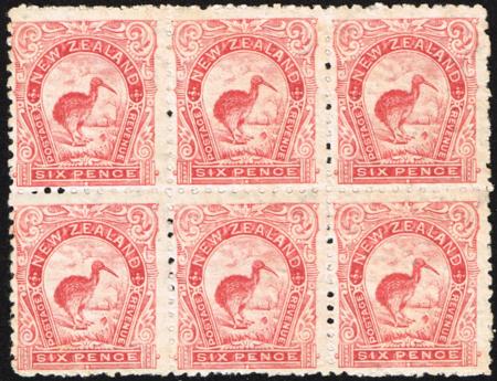 | 1898 Pictorials. 6d perf 11 (sideways wmk.). UHM/LHM block of six in rose-carmine. Tone speckles on gum. CP E14e(3), SG 312b. |