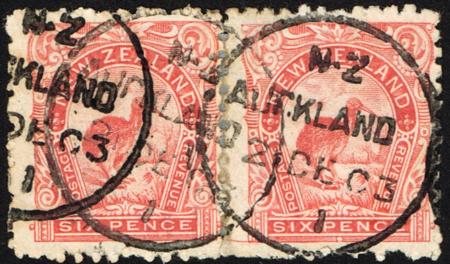 | 1898 Pictorials. 6d perf 11 (sideways wmk.). Used (2 DE 03) pair in the scarce salmon shade (was split but rejoined). CP E14e(6), SG 312. |