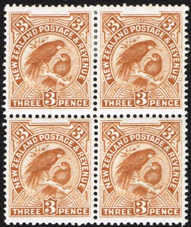 | 1907 Pictorials. 3d reduced yellow-brown. Perf 14 x 15. UHM/Mint block of four. Reasonably well centred. CP E10c, SG 383. |