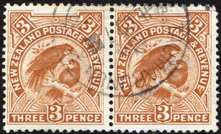 | 1907 Pictorials. 3d reduced perf 14 x 15 in brown. Used pair (9 Nov 1908). Centred to the left. CP E10c, SG 383.