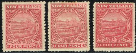 | 1898 Pictorials. 4d London print. Three mint singles in different shades. A couple of perf tones. CP E11a, SG 252. Catalogue value $150.