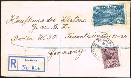 | 1908 2½d (perf 14) plus 2d tied on registered cover (21 March 1910) to Germany. Correct 2½d registration plus 2d postage.