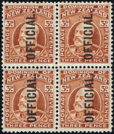 | KEVII 3d Official. Perf 14 x 13½ in UHM/Mint block of four. CP HO3c, SG 319a. Scarce. |