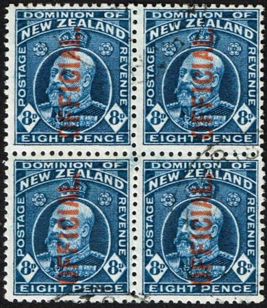 | KEVII 8d Official. Fine used block of four two-perf pairs. CP HO7d, SG O76c. |