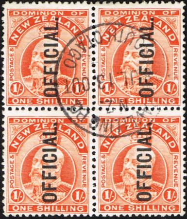 | KEVII 1/- Official. Fine used (Travelling PO, Outbound Otago. 8 July 1913) block of four. Centred towards the base. CP HO8b, SG O77. |
