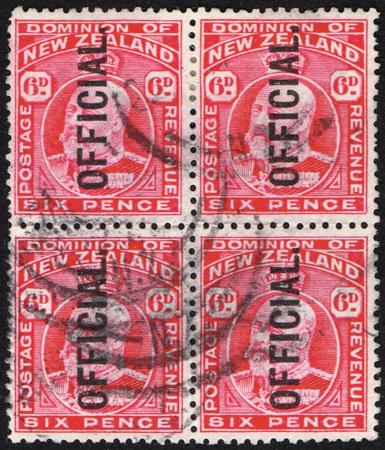 | KEVII 6d Official. Used block of four. Centred slightly left. CP HO6b, SG O75.