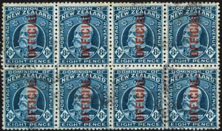 | KEVII 8d Official. Perf 14 x 13½. Used block of eight. CP HO7c, SG O76b. |