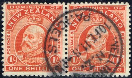 | KEVII 1/-. Line perf 14. Used (1911) pair. Slightly top centred. CP H8a, SG 399.
