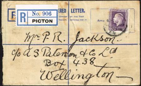 | KGV Recess. 4d violet, perf 14 x 14¼ on 1884 registered envelope (10 Dec 192?). Toning and flap missing. |