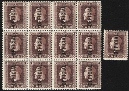 | KGV Recess Official. 3d. UHM single and UHM/Mint block of 12. CP KO4d. SG O106. |