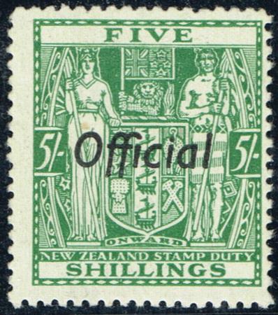 | 5/- Arms Official. Single watermark. Very lightly hinged mint. Right centred. Small tone spot. CP ZO33b, SG O119. Catalogue value $200.