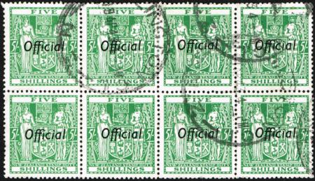 | 5/- Arms Official perf 14 (multi upright wmk.). Used (1943) block of eight. CP ZO33c, SG O133.