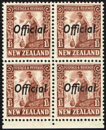 | 1935 1½d Official. Perf 14 x 13½. UHM/LHM block of four. CP LO3d, SG O122.