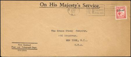 | 1935 1d Official (Die III). Tied on OHMS cover to the USA (11 Dec 1937). |