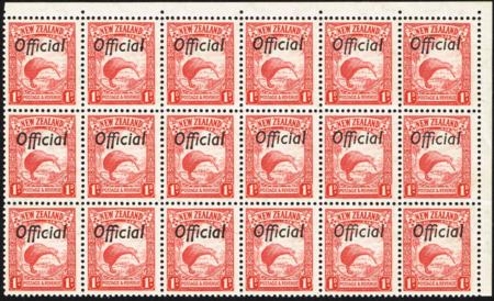 | 1935 1d Official. Perf 14 x 13½ (multi wmk.). UHM plate block of 18 from the top right corner of the sheet. With the Row 1/23 flaw. Left centred. Light fold. CP LO2d, SG O121. |