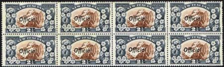 | 1935 2½d Official. Comb perf 14. UHM block of eight. With the Row 2/2 flaws (dots on right hand flower). With description. CP LO5e, SG O124. |