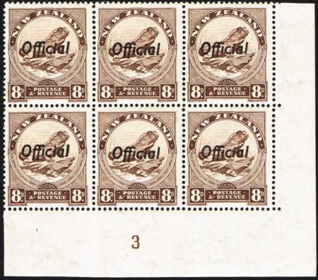 | 1935 8d Official. Perf 14 x 14½. UHM plate block of four plus part attached pair (makes block of six). Centred towards the lower left. CP LO10e, SG O128a. |