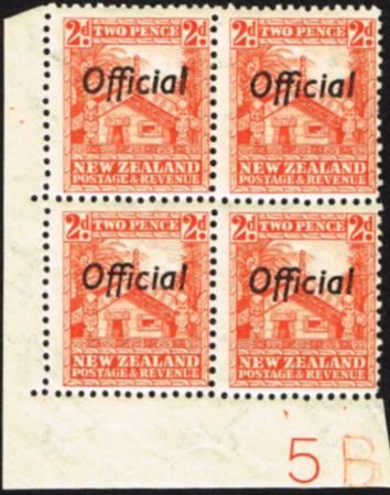 | 1935 2d Official. Perf 14 x 13½ (coarse mesh). LHM plate block of four (plate 5B). Right centred. Gum tone spot. CP LO4f, SG O123. |