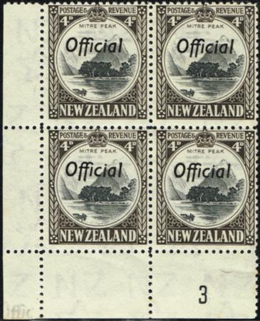 | 1935 4d Official. Perf 12½. UHM plate block of four (plate 3). Has double print of overprint in lower left corner. Top right centred. CP LO7d, SG O126b.