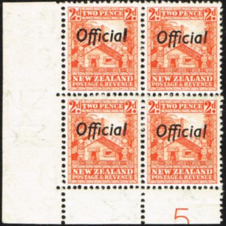 | 1935 2d Official. Perf 14 x 13½ (coarse mesh). UHM plate block of four (plate 5). Well centred. CP LO4f, SG O123.