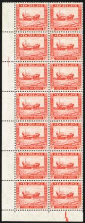 | 1935 6d perf 13½ x 14 (fine mesh). UHM vertical plate block of 14 (2 x 7). 1cm+ plate crack. Reasonably centred. One light gum tone spot. CP L9b, SG 585. |
