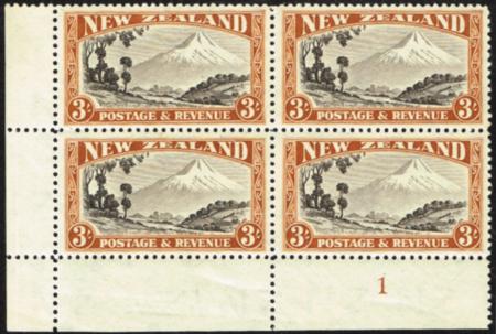 | 1935 3/- perf 12½. VLHM plate block of four. CP L14e, SG 590b. Scarce. Catalogue value $1,250.