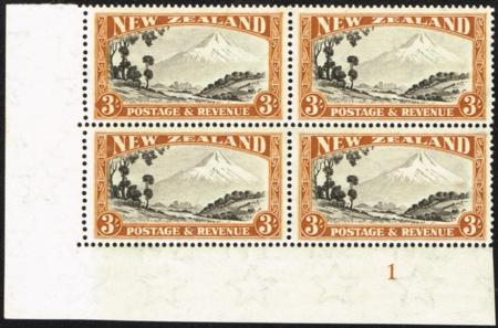 | 1935 3/- perf 14¼ x 13½. UHM plate block of four. Reasonably centred. CP L14g, SG 590c. |