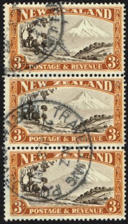 | 1935 3/- single wmk - experimental "wet" printing. Fine used (T.P.O. pmk. 22 July 1937) vertical strip of three. Slightly right centred. CP L14b, SG 569a.