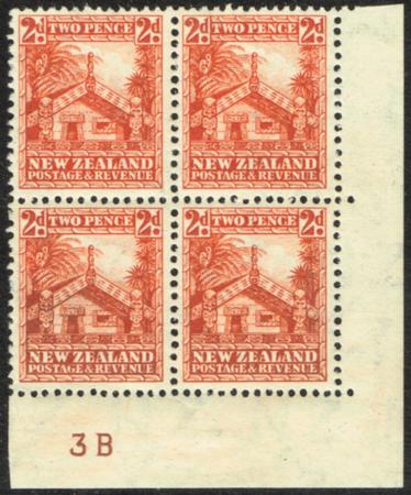 | 1935 2d perf 14 x 13½ (coarse mesh). LHM plate block (plate 3B) of four. Centred to the top left. Slight oxidising at the bottom. CP L4f, SG 580. |