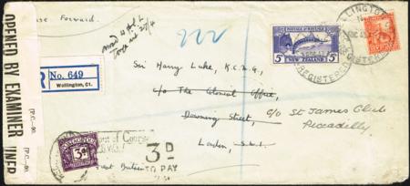 | 1935 Pictorial. 5d plus 2d on censored long registered cover to London. Short paid and GB 3d (damaged) postage due tied.
