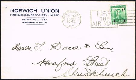 | KGVI. 1d on ½d green on 1942 cover with overprint variety. CP M3a(Z), SG 628. |