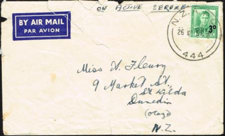 | KGVI. 3d on 1d green. Used on NZSCo (on flap) cover 'Posted at Sea' (1953).