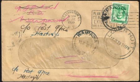 | ½d green KGVI stamp pays the correct inland surface commercial papers rate. Much redirected (1939). |