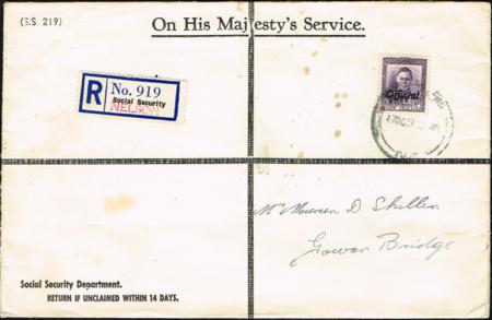 | 8d KGVI Official on printed OHMS registered 1951 cover to Gowan Bridge. Correct 4d reg. plus 4d double rate postage (2d per ounce). A few spots on the front. |