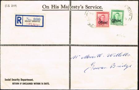 | KGVI 6d and 1d Officials on OHMS registered printed cover (25 April 1951). Correct 4d reg plus 3d postage rate. |