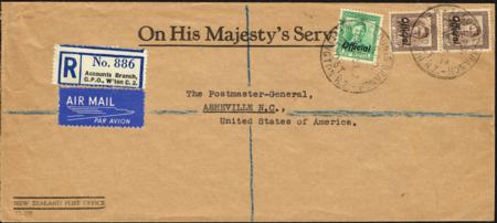 | KGVI. 1d plus 9d pair Officials on long registered airmail OHMS cover (25 June 1951) to the USA. Correct 4d reg plus 1/3d airmail rate.