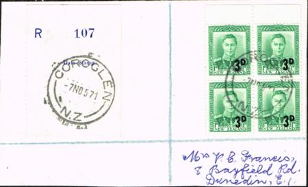 | 1957 registered cover franked with KGVI 3d on 1d green in selvedge block of four. Posted 7 Nov 1957. Correct 9d reg. plus 3d postage rate. A superb example of correct rate posting. |