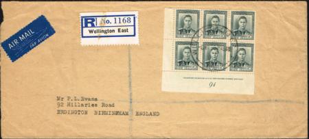 | KGVI 5d plate block (91) of six used on registered airmail cover to UK (6 March 1950).