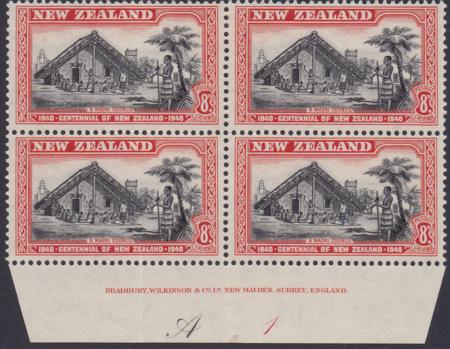 | 1940 Centennial. 8d LHM plate block of four. Centred towards the top. CP S35b, SG 623. Catalogue value $180.