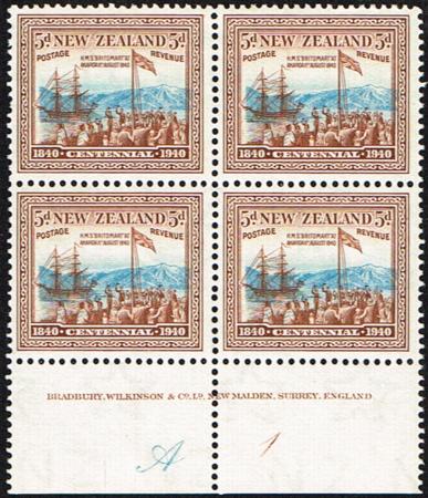 | 1940 Centennial. 5d plate block of four. Mint. Slightly left centred. CP S33a, SG 620. |